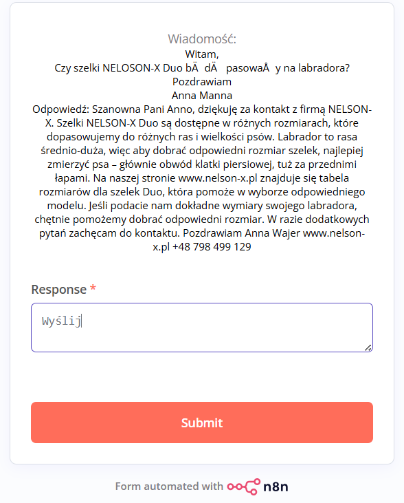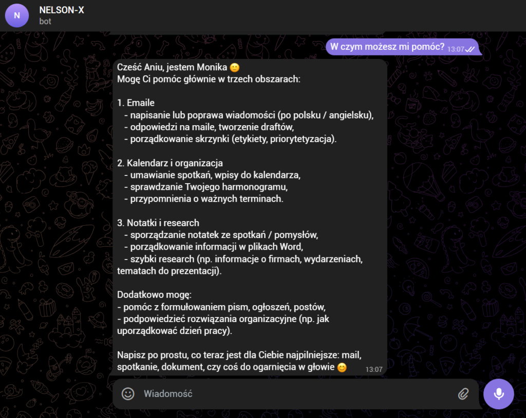 wdrożyliśmy chatbota-asystentkę dla firmy NELSON-X. Asystentka reaguje na głosówki oraz informacje teksowe i potrafi: